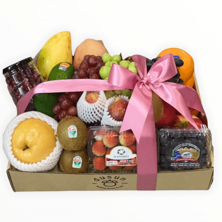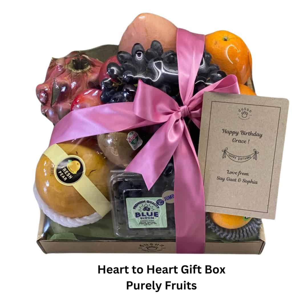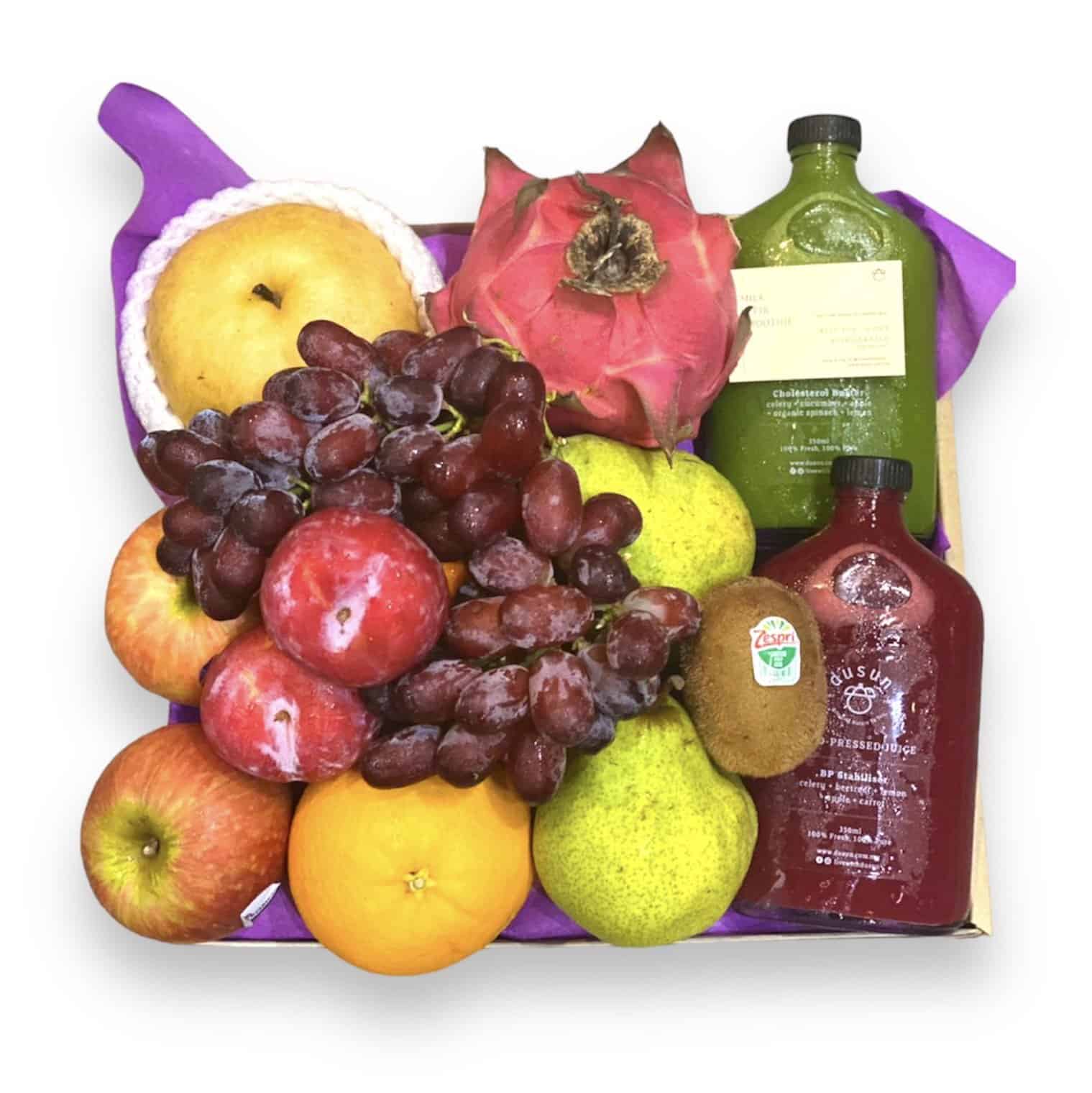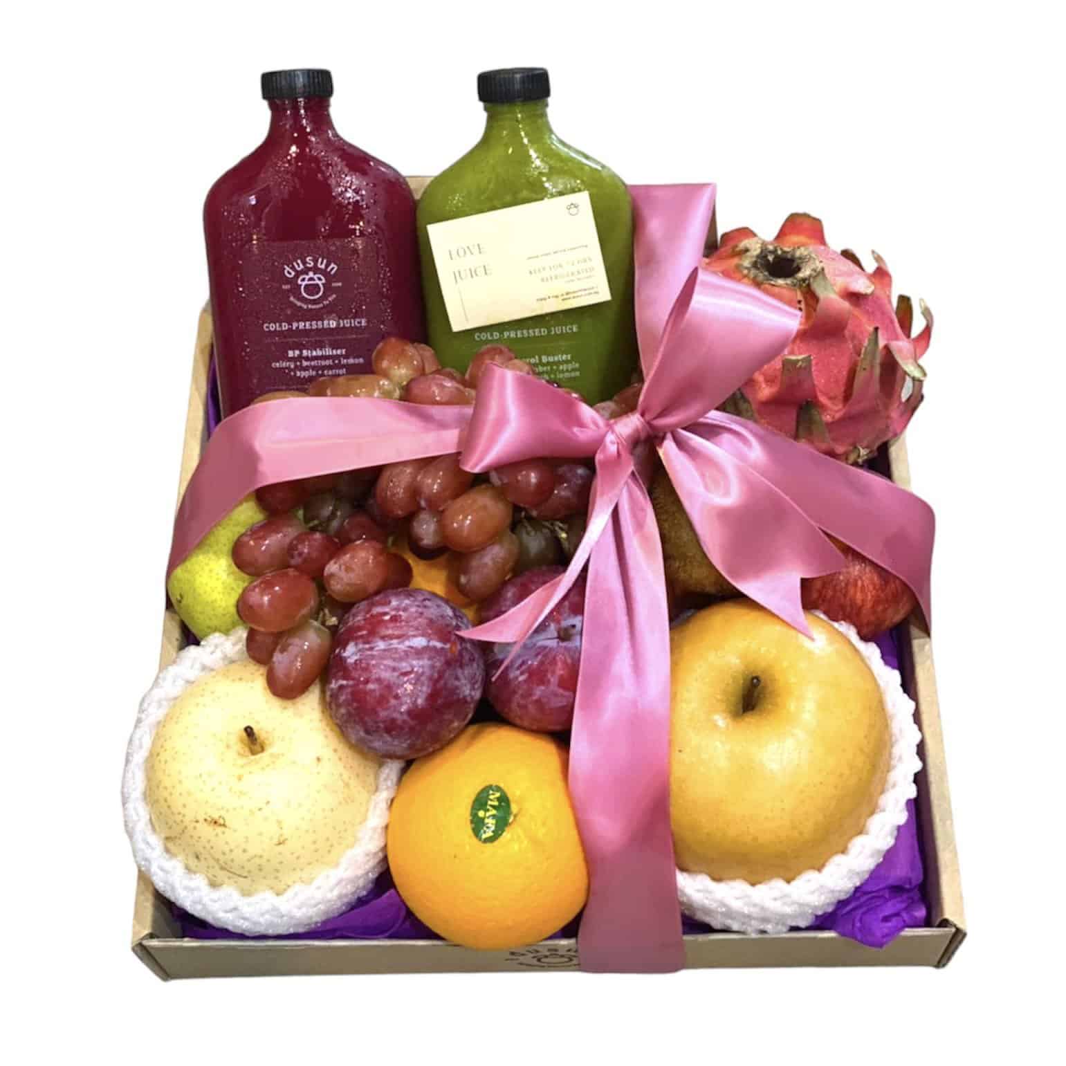 This Heart to Heart gift box contains 2x cold-pressed juice value rm26 & seasonal fruits selected by us 🙂