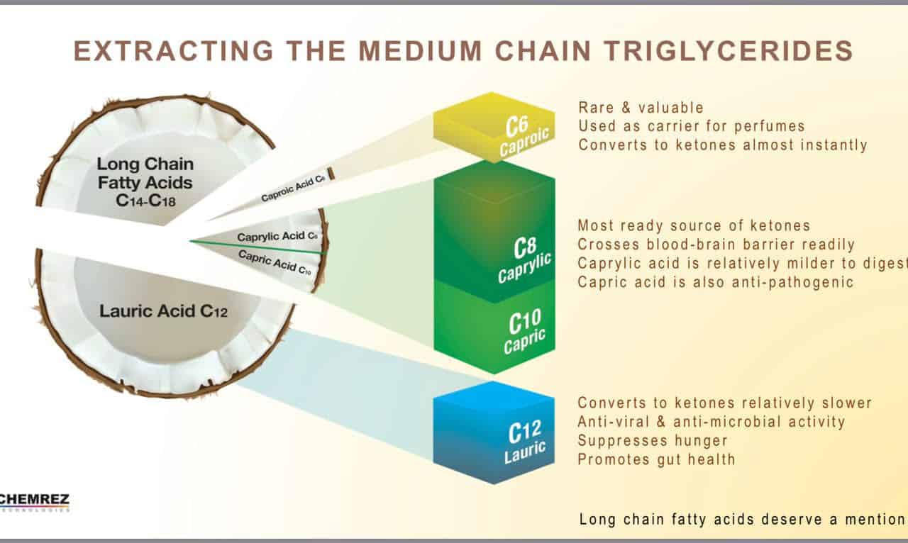Medium-Chain Triglycerides (MCTs) are “healthy fats” with a chemical structure that allows the body to digest them easily. Most fats are broken down in the intestine and remade into a special form that can be transported in the blood. MCTs, however, bypass the digestion process intact and are taken into the bloodstream where they are used as quick energy for the body.