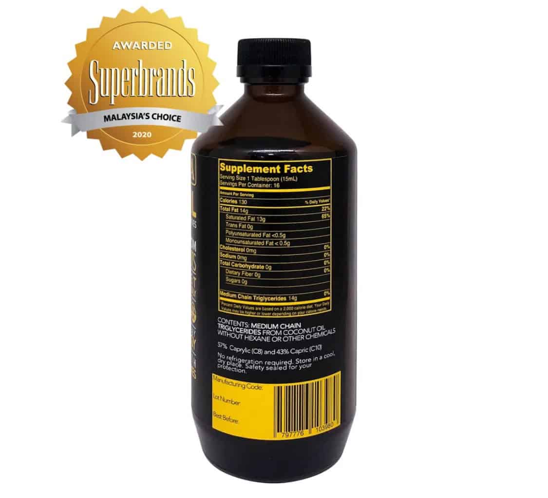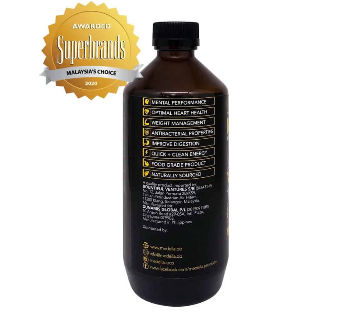 Medella MCT Oil is derived purely from coconut oil and contains a mix of 57% Caprylic (C8) and 43% Capric (C10) fatty acids with only trace amounts of lauric acid; a pure form for MCT Oil compared to other conventional MCT Oil products.